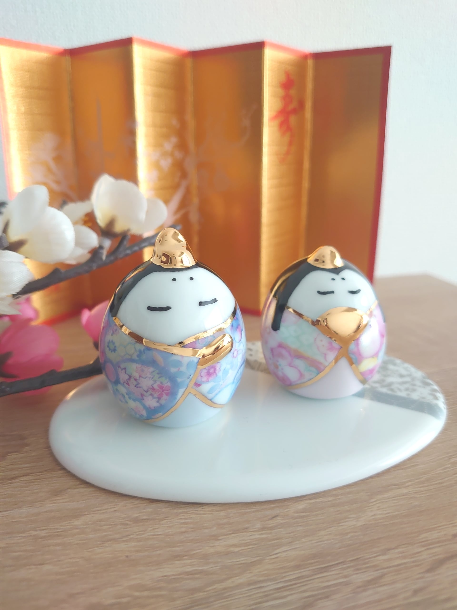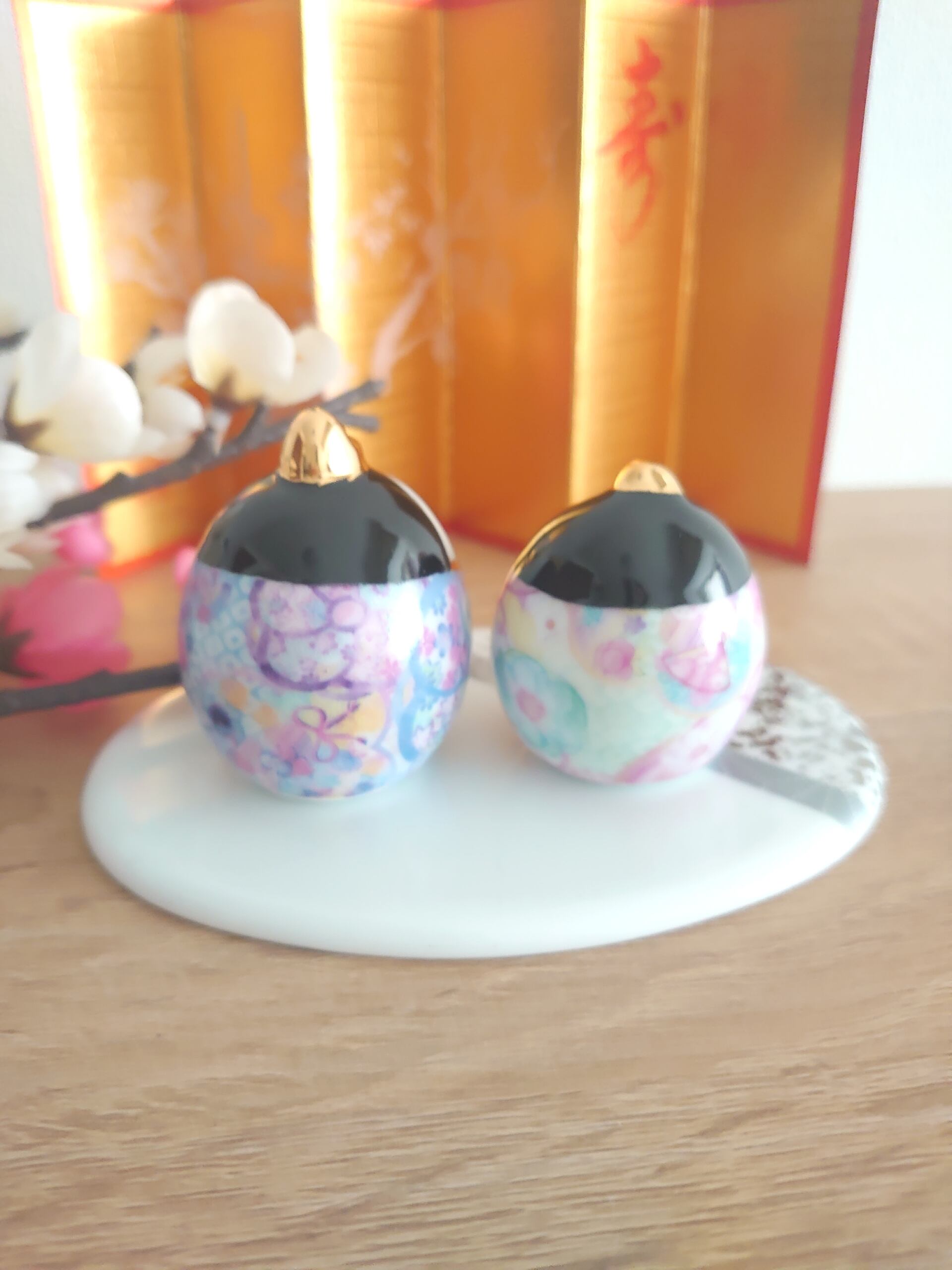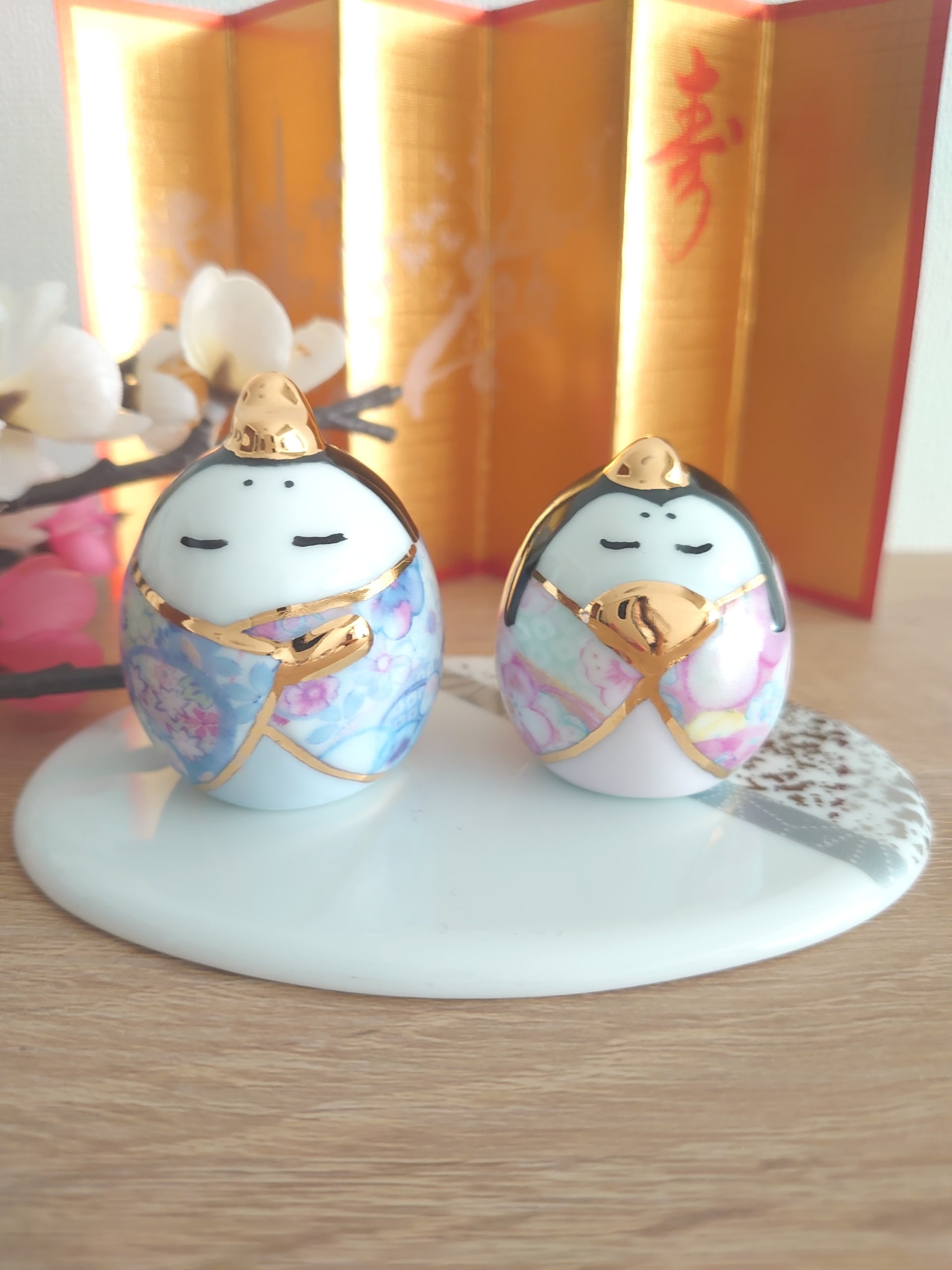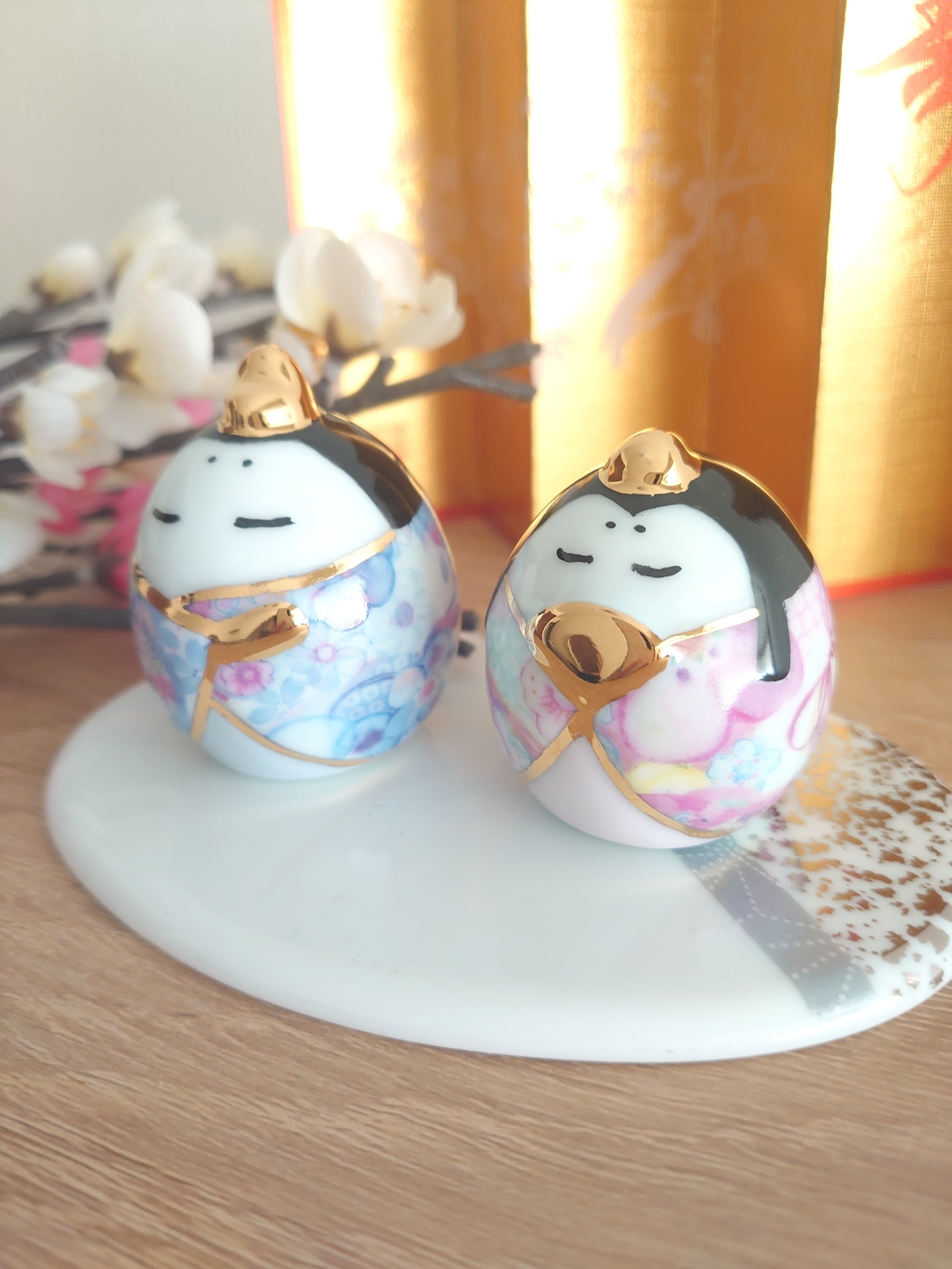 手のひらサイズのころんとした可愛いたまご雛と台座の3点セットです。